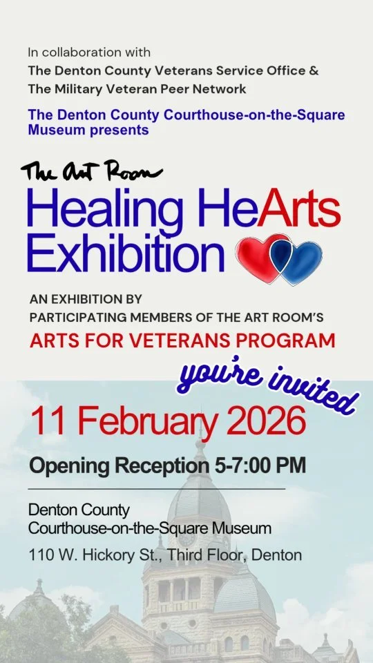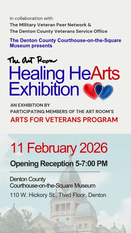 The Art Room’s Healing HeArts Exhibition celebrates the artistic accomplishments of the Members of our Arts for Veterans program. The community is invited to our February 11 opening reception, 5-7:00 p.m. at the Denton County Courthouse-on-the-Square Museum, 110 W. Hickory St., Third Floor. We’re excited to partner with the Denton County Courthouse Museum on this upcoming exhibition!